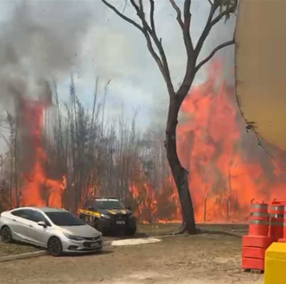 Incêndio às margens da Dutra avança sobre área da base da PRF e destrói viaturas