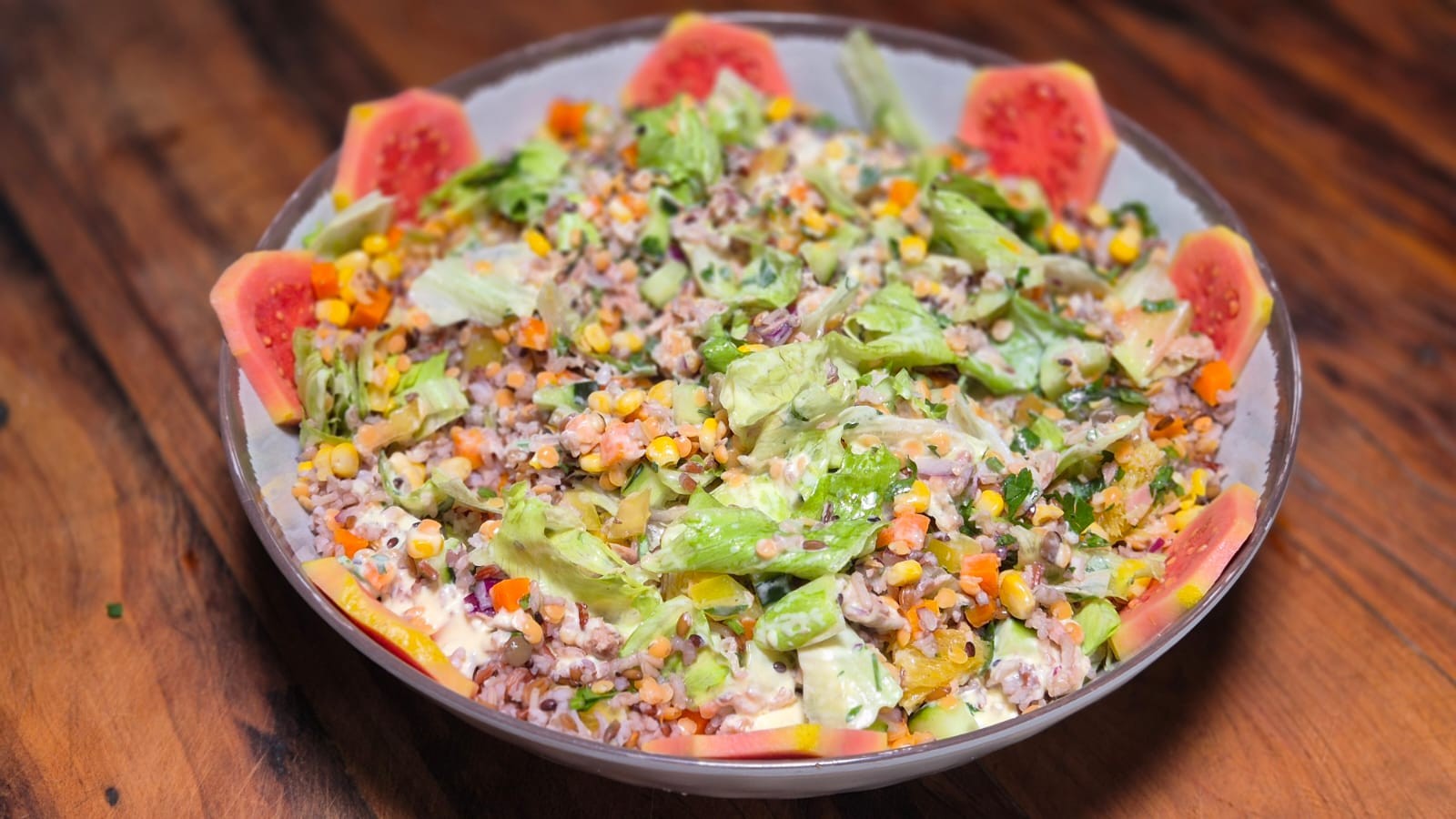 Depois, adicione metade da lentilha, tomate, pepino japonês, atum, cebola roxa, milho verde e algumas folhas de alface e cenoura.